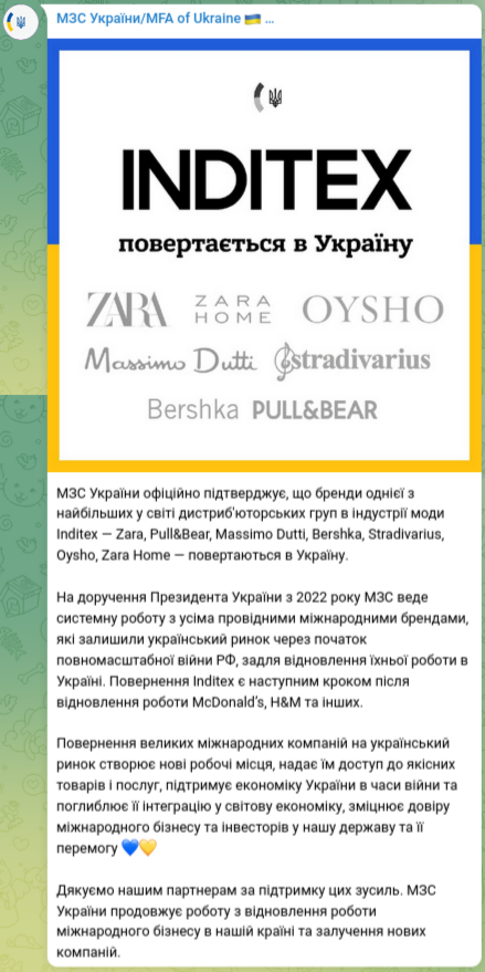 Дипломаты вели переговоры с холдингом модной одежды Inditex по распоряжению президента Владимира Зеленского.