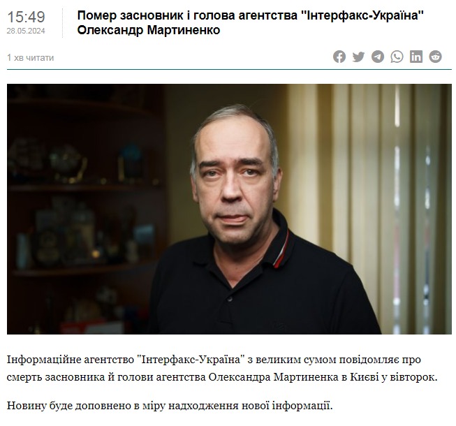 На 64-м году жизни скончался основатель и глава агентства "Интерфакс-Украина", известный украинский журналист Александр Мартыненко.