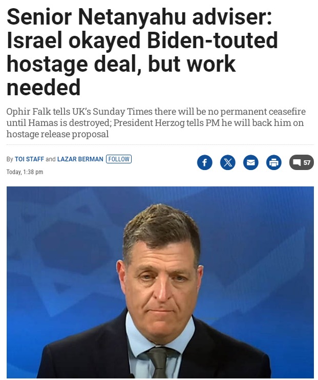 Фальк добавил, что предложенное соглашение "имеет множество деталей, которые необходимо проработать". По его словам, "постоянного прекращения огня не будет до тех пор, пока цели Израиля не будут достигнуты". Он перечислил главные цели Израиля, которые остаются неизменными: освобождение всех заложников и "ликвидация ХАМАС как геноцидной террористической организации".