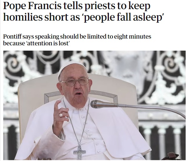 Папа римский Франциск призвал священников делать проповеди короткими, поскольку "люди во время них засыпают". По словам понтифика, назидательная речь должна длиться восемь минут, иначе внимание верующих рассеивается.