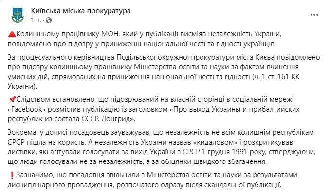 Как установило следствие, мужчина на своей странице в социальной сети разместил публикацию с заголовком "О выходе Украины и прибалтийских республик из состава СССР. Лонгрид". В посте чиновник написал, что независимость не всем бывшим республикам СССР пошла на пользу. А независимость Украины назвал "кидаловом" и раскритиковал листовки, которые агитировали голосовать за выход Украины из СССР 1 декабря 1991 года, утверждая, что люди голосовали не за независимость, а за обещания быстрого обогащения.