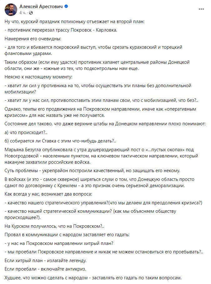 "Противник перерезал трассу Покровск — Карловка. Намерения его очевидны: для того и вбивается покровский выступ, чтобы срезать кураховский и торецкий фланговыми ударами. Таким образом (если ему удастся) противник хапанет центральные районы Донецкой области, они же — южные из тех, что подконтрольны нам еще", — написал он.