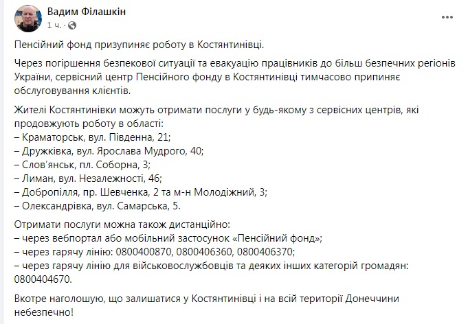 "Из-за ухудшения ситуации и эвакуации работников в более безопасные регионы Украины сервисный центр Пенсионного фонда в Константиновке временно прекращает обслуживание клиентов", - сказано в публикации.