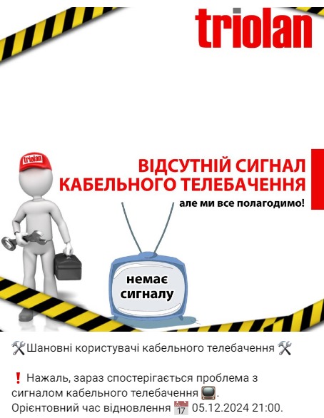 "Триолан" тем временем сообщает в своем телеграм-канале о проблемах с ТВ-сигналом.