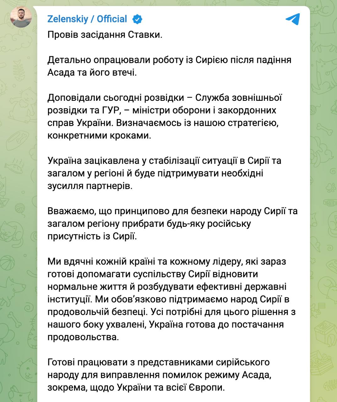 "Украина заинтересована в стабилизации ситуации в Сирии и, в целом, в регионе и будет поддерживать необходимые усилия партнеров. Считаем, что принципиально для безопасности народа Сирии и региона убрать любое российское присутствие из Сирии", - пишет Зеленский.
