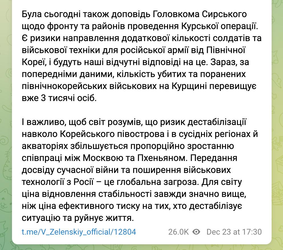 Он утверждает, что в Курской области уже были убиты и ранены более 3000 северокорейских военных.