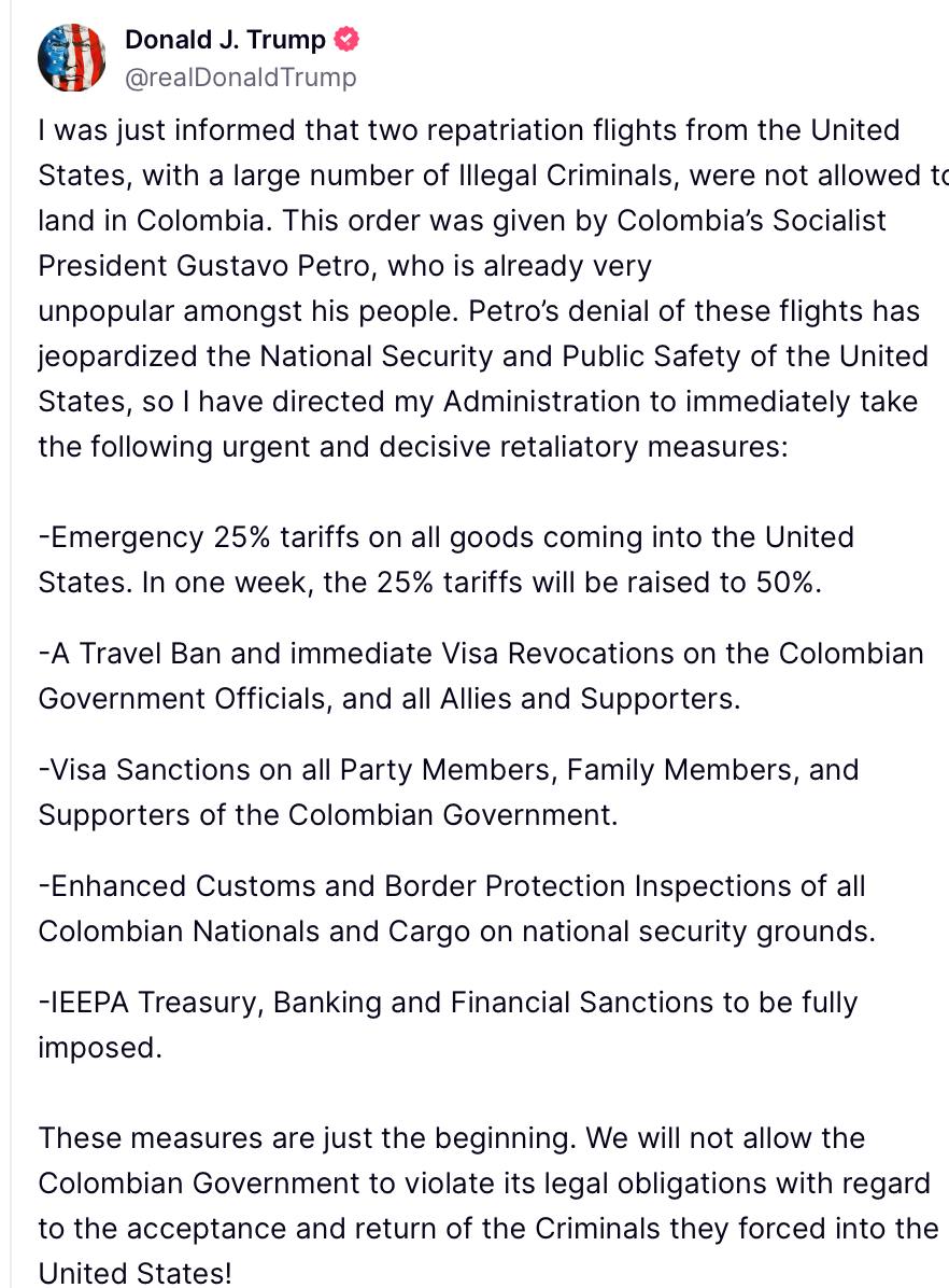 Ранее Богота отказалась принять два борта с колумбийцами, которых выслали из США. По словам Трампа, "через неделю 25-процентные пошлины будут повышены до 50%".