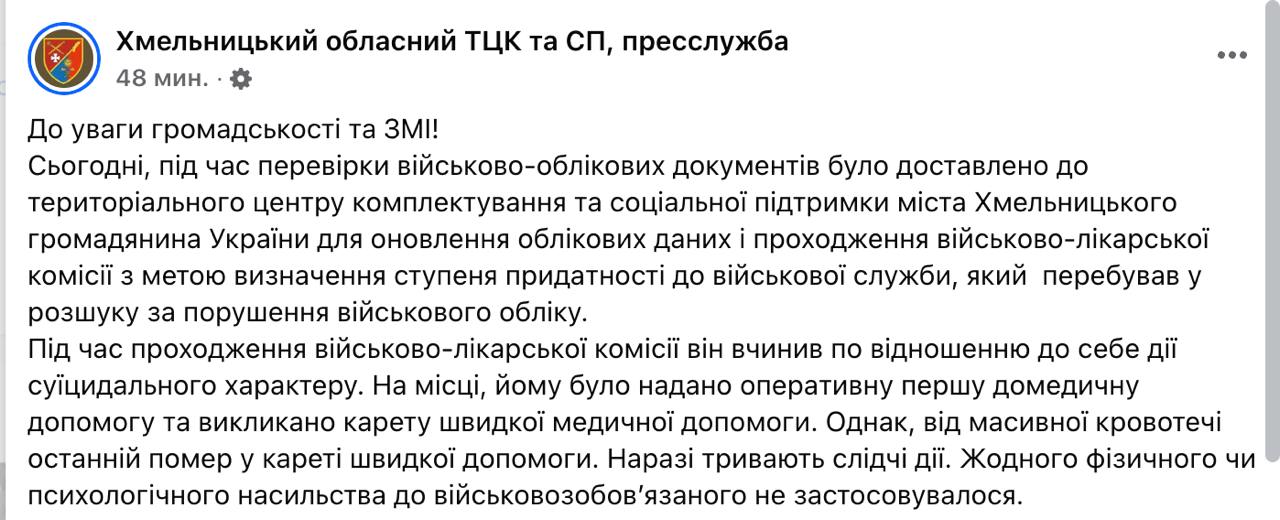 Ранее пресс-служба ТЦК сообщила о самоубийстве, но не опубликовала никаких подробностей.