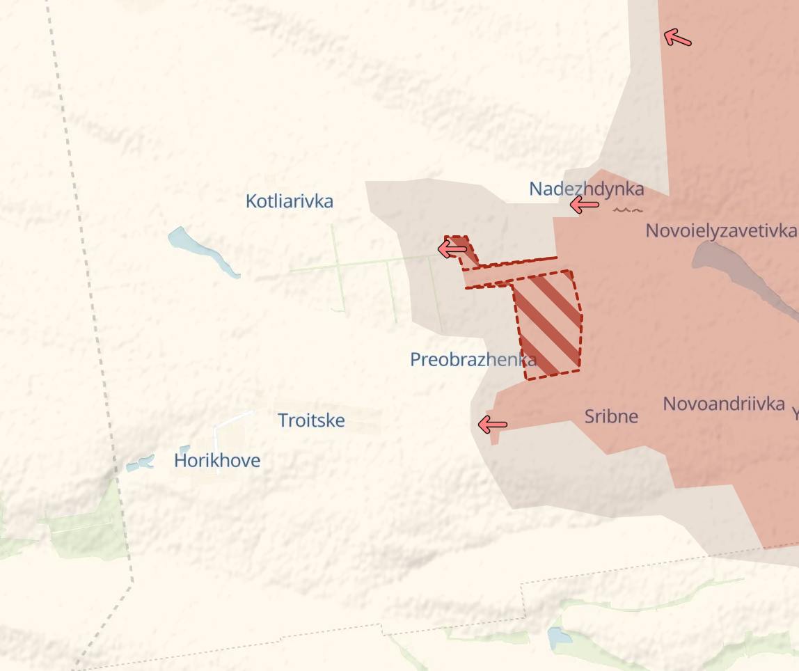 Продвижение россиян фиксирует и украинский паблик Deep State. По его данным, за последние несколько дней войска РФ заняли ряд территорий в районе Котляровки, Преображенки и Надеждинки, а также севернее, в районе Успеновки.
