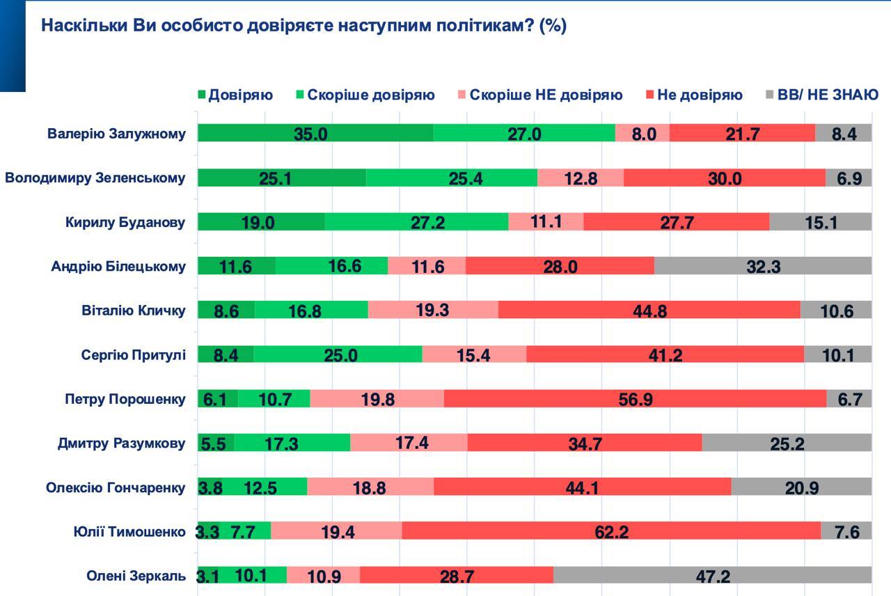 При этом лидером доверия украинцев является экс-главком Валерий Залужный - ему так или иначе доверяют 62%.