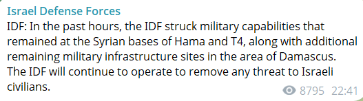 Напомним, после свержения Асада Израиль начал наземное вторжение в Сирию за пределами буферной зоны на Голанских высотах. Также он нанес удары по сирийским военным базам.