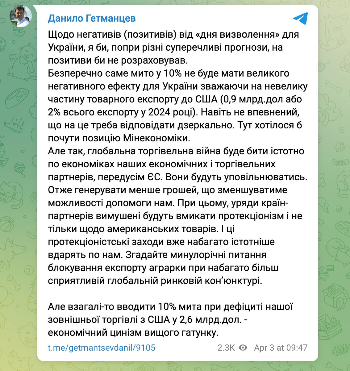 "Наш экспорт туда (в США - Ред.) даже не дотягивает до миллиарда и 2% от всего, что мы куда-то экспортируем. США к нам завозят почти на 3 млрд, вообще 5 раз больше. Поэтому мы получили "лайт" тариф всего в 10%. Больше всего мы ввозили металлургическую продукцию, но там уже и так с марта для нас тариф 25% на сталь и алюминий. Еще трубы, но там тоже тариф уже есть антидемпинг", - пишет Железняк.