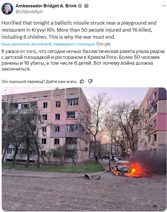 "В ужасе от того, что сегодня вечером баллистическая ракета упала рядом с детской площадкой и рестораном в Кривом Роге. Более 50 человек ранены и 16 убиты, в том числе 6 детей. Вот почему война должна закончиться", – написала Бринк в Х.