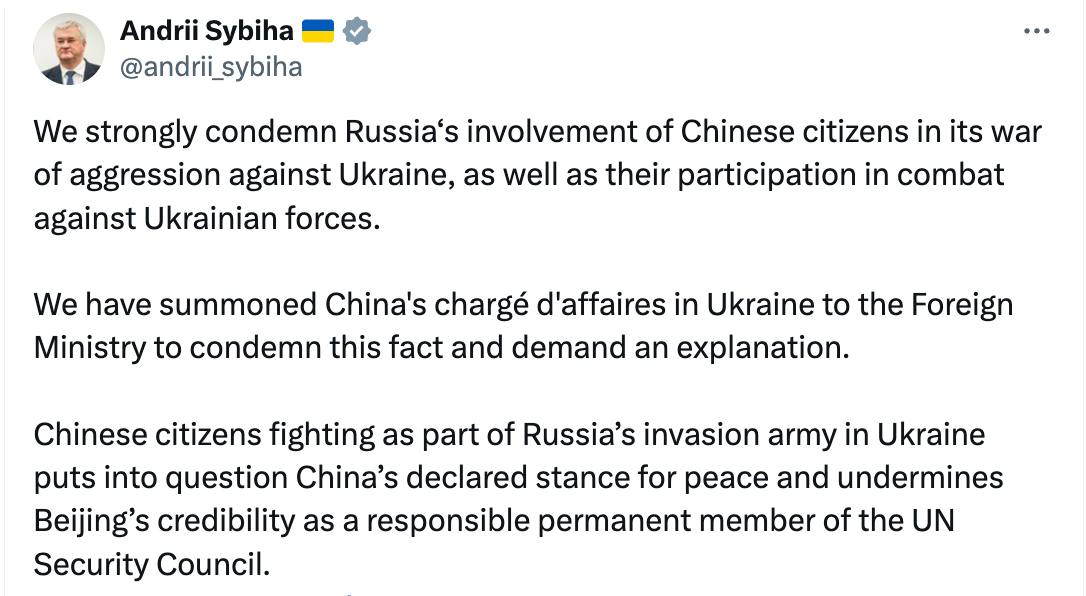 16.34 МИД Украины вызвал поверенного в Киеве по делам Китая после пленение двух китайцев и намерен требовать объяснений, сообщает министр Сибига. Он пишет, что участие китайцев в войне на стороне РФ "ставит под сомнение заявленную Китаем позицию за мир и подрывают доверие к Пекину как к ответственному постоянному члену Совета Безопасности ООН".