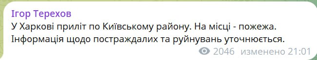 21.04 В Харькове прилет по Киевскому району, сообщил мэр Терехов.