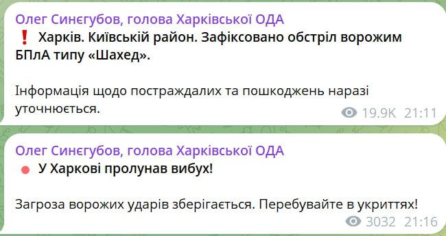 21.21 Еще один взрыв в Харькове, сообщил глава ОВА Синегубов.