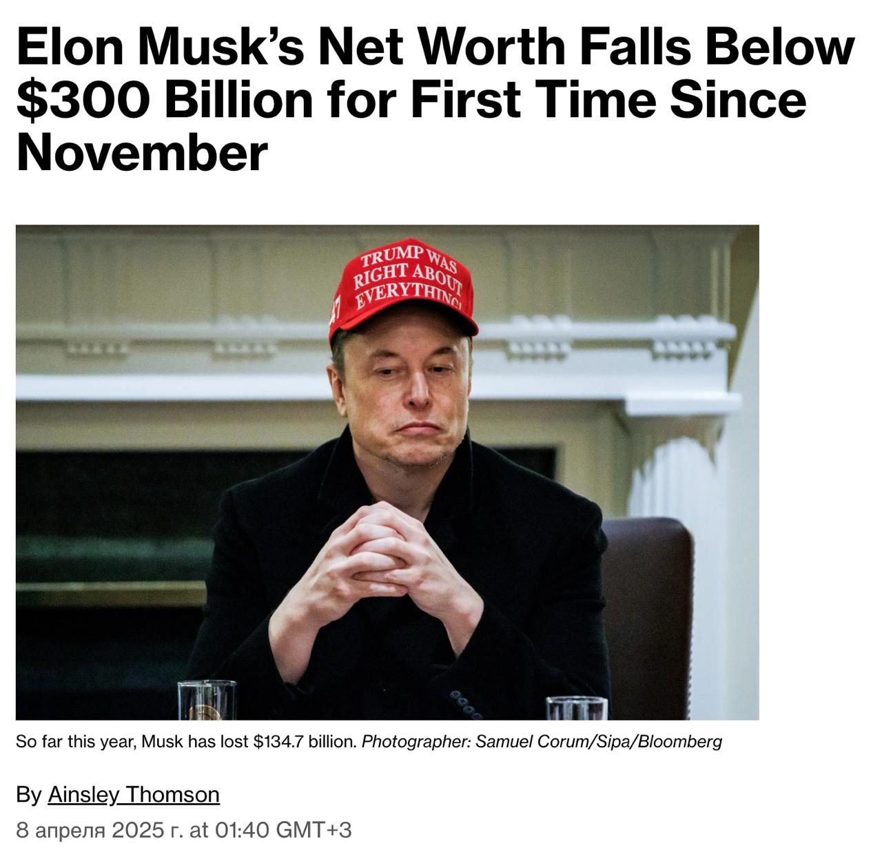 В Bloomberg отмечают, что из-за тарифов состояние главы Tesla впервые с ноября опустилось ниже 300 миллиардов долларов.