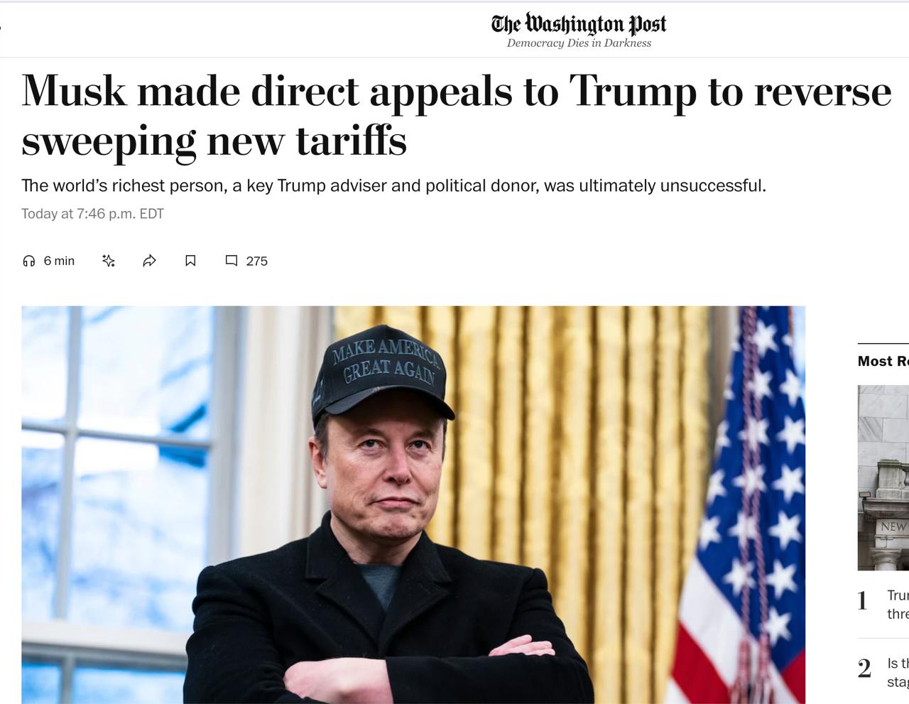 Маск призвал Трампа отменить взаимные пошлины - The Washington Post