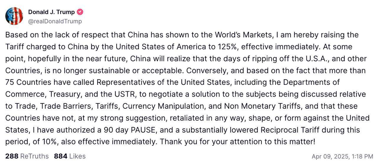 "Исходя из отсутствия уважения, которое Китай проявил к мировым рынкам, я повышаю тариф, взимаемый с Китая Соединенными Штатами Америки, до 125%, который вступает в силу немедленно", - написал Трамп.