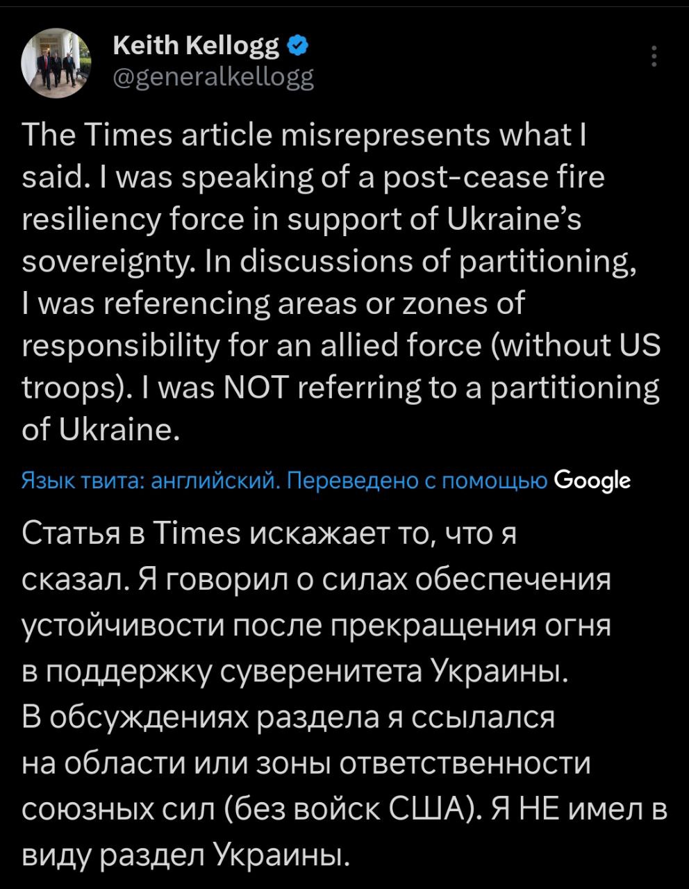 "Статья в The Times искажает то, что я сказал. Я говорил о силах устойчивости после прекращения огня в поддержку суверенитета Украины. В обсуждениях разделения я имел в виду районы или зоны ответственности для союзных сил (без участия войск США). Я НЕ имел в виду раздел Украины", - написал Келлог.
