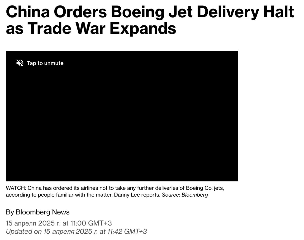 У китайских авиакомпаний, включая China Southern Airlines Co., Air China Ltd. и Xiamen Airlines Co., есть контракты на поставку около десяти самолетов Boeing 737 Max. По словам источников Bloomberg, Пекин еще может принять часть из них, поскольку документы на них оформили до 12 апреля, то есть до даты вступления в силу китайских пошлин.