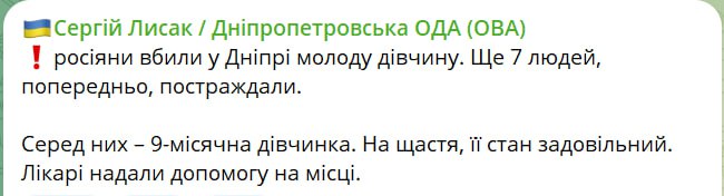 Об этом сообщил глава Днепропетровской областной военной администрации Сергей Лысак в своем телеграм-канале.