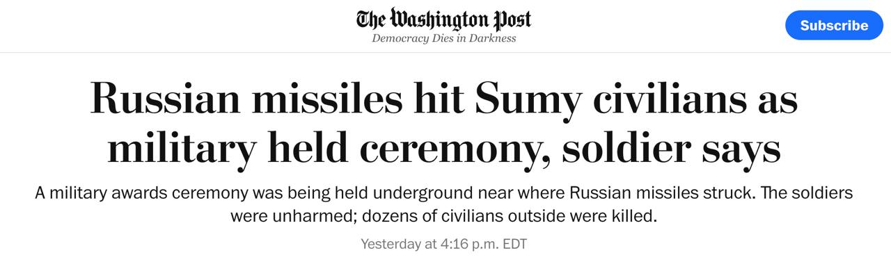 Напомним, утром в воскресенье 13 апреля россияне нанесли удар двумя баллистическими ракетами по центру Сум. Погибли 35 человек, среди них дети. 117 человек получили ранения, из них 15 детей.