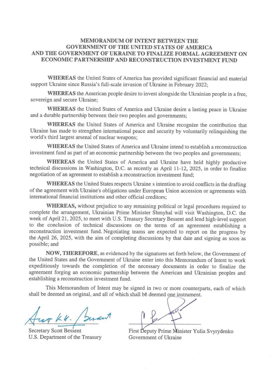 "Сегодня сделали шаг к общему с США соглашению об экономическом партнерстве. Украина и Соединенные Штаты Америки подписали меморандум, удостоверяющий конструктивную совместную работу наших команд и намерение финализировать и заключить соглашение, которое будет выгодно обоим нашим народам. Впереди финализация текста соглашения и его подписание", - написала Свириденко в Фейсбуке.