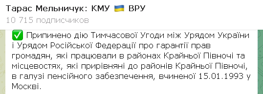 "Прекращено действие временного соглашения между правительством Украины и правительством Российской Федерации о гарантиях прав граждан, работавших в районах Крайнего Севера и местностях, приравненных к районам Крайнего Севера, в области пенсионного обеспечения", - написал он.