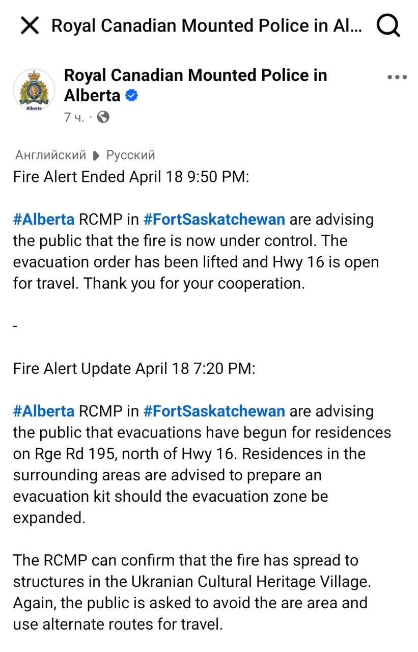 "Можем подтвердить, что огонь распространился на постройки в селе наследия украинской культуры. Просим общественность избегать этого района и использовать альтернативные районы для передвижения", - говорится на странице полиции.