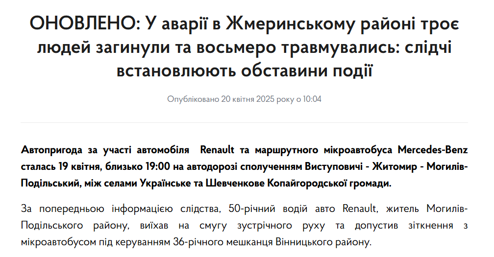 По данным правоохранителей, инцидент случился на автодороге Выступовичи - Житомир - Могилев-Подольский, между селами Украинское и Шевченково Копайгородской громады.
