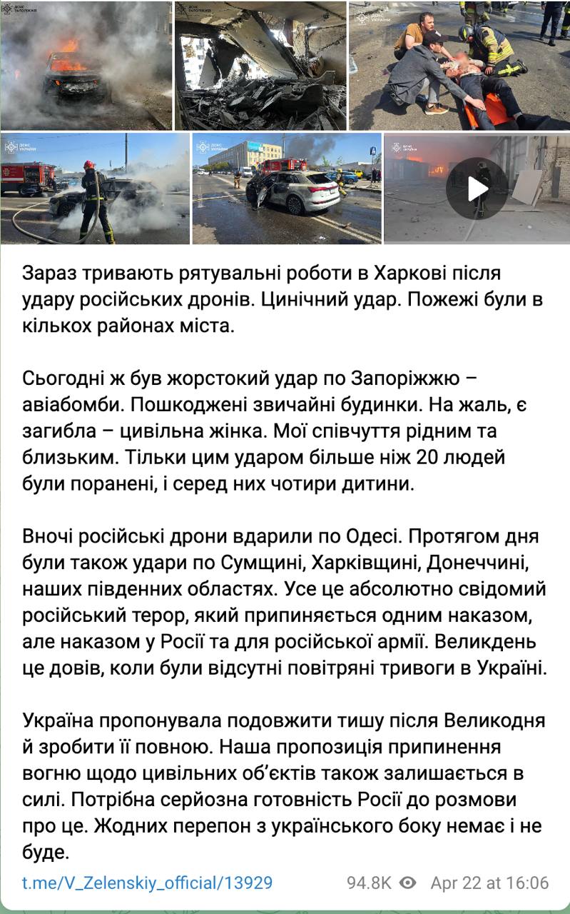"Украина предлагала продлить тишину после Пасхи и сделать ее полной. Наше предложение о прекращении огня в отношении гражданских объектов также остается в силе. Нужна серьезная готовность России к разговору об этом. Никаких препятствий с украинской стороны нет и не будет", - написал Зеленский в посте о сегодняшних обстрелах Харькова и Запорожья.