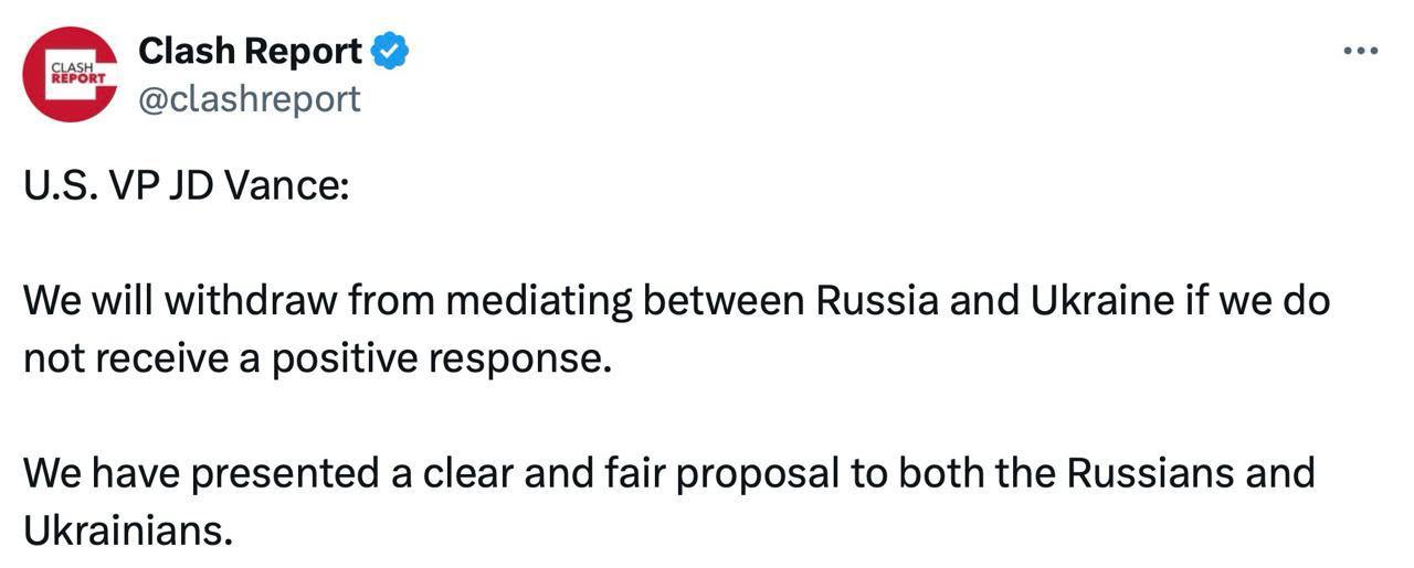 Вице-президент США Джей Ди Вэнс заявил, что Вашингтон откажется от посредничества между РФ и Украиной, если не получит положительного ответа. Видимо, он имеет в виду ответ на американские условия установления мира, изложенные в опубликованном СМИ плане урегулирования конфликта.