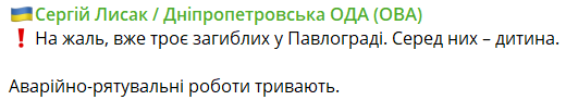 Три человека погибли в результате удара РФ по Павлограду, среди них – ребенок. Шесть пострадавших госпитализированы. Одна пациентка тяжелая, остальные – в состоянии средней тяжести.
