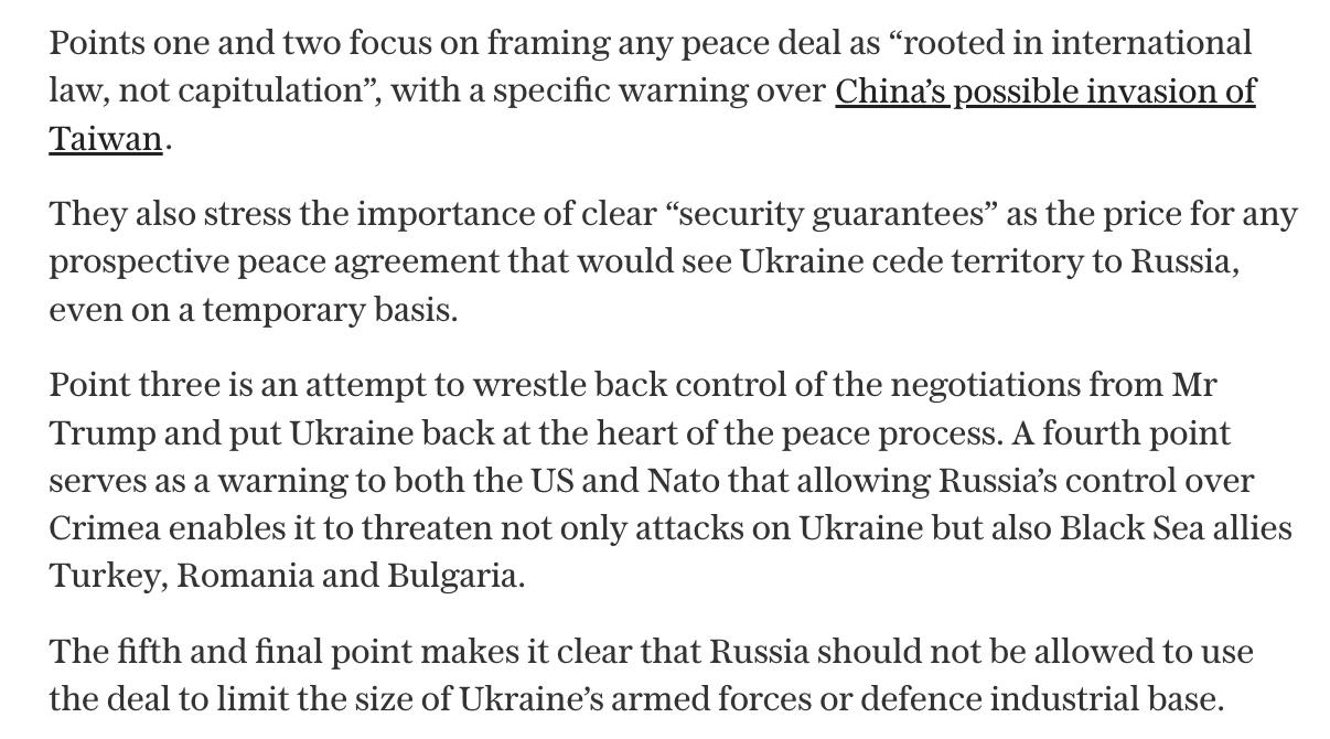 "Третий пункт - это попытка вырвать контроль над переговорами у Трампа и вернуть Украину в центр мирного процесса. Четвертый пункт служит предупреждением как для США, так и для НАТО, что предоставление России контроля над Крымом позволяет ей угрожать атаками не только на Украину, но и на союзников по Черному морю - Турцию, Румынию и Болгарию. Пятый, и последний, пункт ясно дает понять, что России не должно быть позволено использовать сделку для ограничения размера вооруженных сил или оборонно-промышленной базы Украины", - говорится в материале.