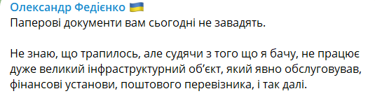 Народный депутат Украины Александр Федиенко предположил, что масштабный сбой в платёжных системах и "Дие" мог быть вызван проблемами на "очень крупном объекте".