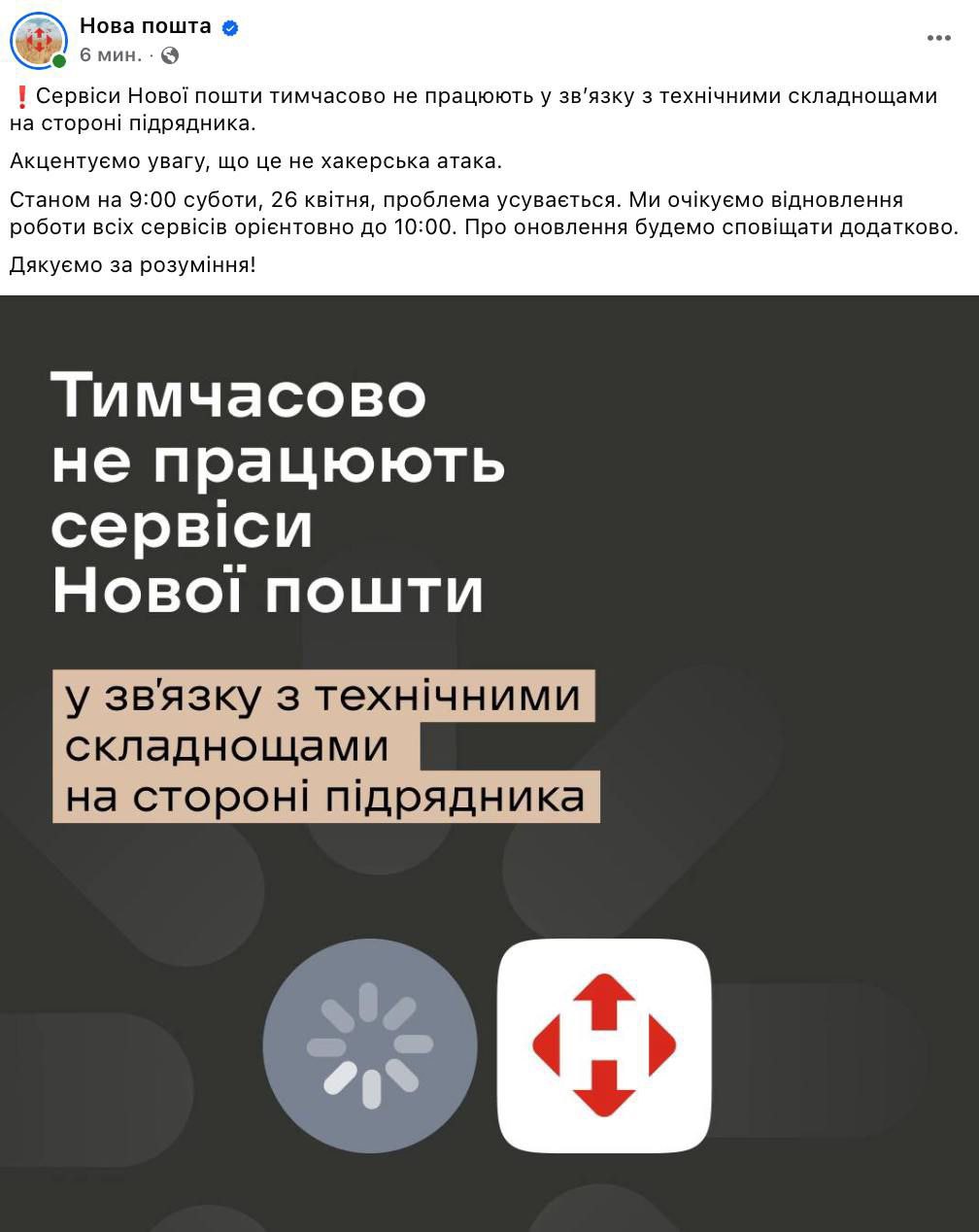 Также не работают сервисы "Новой почты". В компании пишут, что это связано "с трудностями на стороне подрядчика".