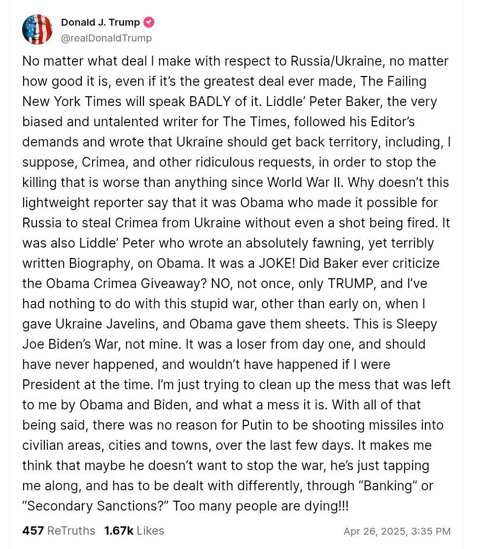 Вот что пишет Трамп: "Неважно, какую сделку я заключу в отношении России и Украины, неважно, насколько она будет хорошей, даже если это будет лучшая сделка в истории, "Провальный New York Times" всё равно будет отзываться о ней ПЛОХО. Маленький Питер Бейкер, крайне предвзятый и бездарный писатель из The Times, выполнил указание своего редактора и написал, что Украине следует вернуть себе территории, включая, как я понимаю, Крым, и выдвинул другие нелепые требования, чтобы остановить бойню, худшую со времён Второй мировой войны. Почему же этот легковесный репортёр не пишет о том, что именно Обама позволил России захватить Крым у Украины без единого выстрела? Именно Маленький Питер написал абсолютно льстивую, но ужасно написанную биографию Обамы. Это была ШУТКА! Критиковал ли Бейкер когда-нибудь "подарок Крыма" от Обамы? НИ РАЗУ, только ТРАМПА, хотя я не имел никакого отношения к этой глупой войне, кроме того, что в самом начале я передал Украине "Джавелины", тогда как Обама отправил им только простыни. Это война Сонного Джо Байдена, а не моя. Это было проигрышное дело с самого первого дня, и его вообще не должно было случиться - и не случилось бы, если бы я тогда был президентом. Сейчас я просто пытаюсь разобраться с тем бардаком, который мне оставили Обама и Байден, и какой же это ужасный бардак. И при всём при этом нет никакого оправдания тому, что Путин в последние дни обстреливает ракетами гражданские объекты, города и посёлки. Это заставляет меня задуматься: может быть, он и не хочет прекращать войну, а просто водит меня за нос, и с ним нужно обращаться иначе, например через "банковские" или "вторичные санкции"? Слишком много людей погибает!!!"