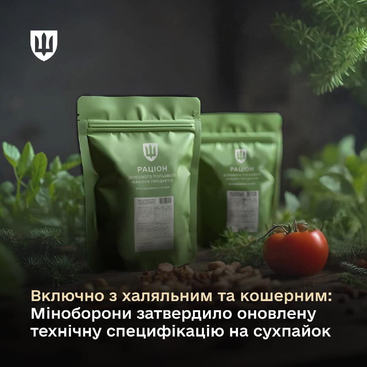 Министерство обороны Украины утвердило обновленную техническую спецификацию на сухпайки. Теперь, кроме обычных, для военных можно закупать халяльные и кошерные сухпайки.