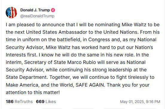 "Я рад объявить, что я выдвину кандидатуру Майка Уолтца на пост следующего посла США в Организации Объединенных Наций. Со времени своей службы в военной форме на поле боя, в конгрессе и в качестве моего советника по национальной безопасности Майк Уолц упорно трудился, чтобы поставить интересы нашей страны на первое место. Я знаю, что он будет делать то же самое в своей новой роли. Тем временем государственный секретарь Марко Рубио будет выполнять обязанности советника по национальной безопасности, продолжая при этом свое сильное руководство в Государственном департаменте. Вместе мы продолжим неустанно бороться за то, чтобы сделать Америку и весь мир снова безопасными", - написал Трамп.