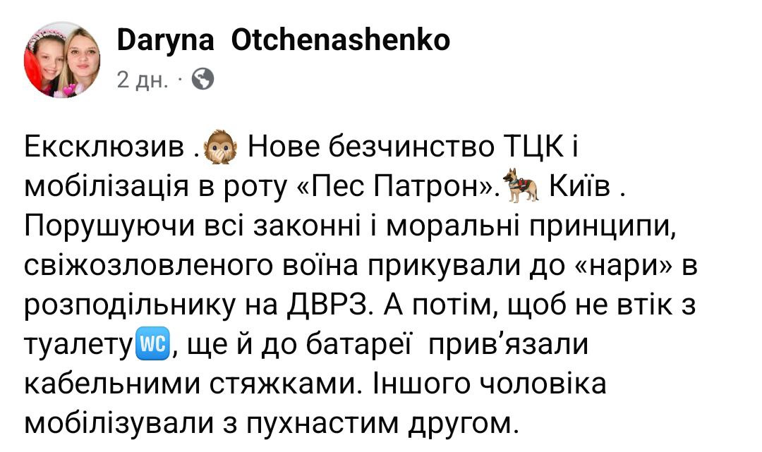 "Новое бесчинство в ТЦК и мобилизация в роту "Пес Патрон". Киев. Нарушая все законные и моральные принципы, свежепойманного воина приковали к нарам в распределителе на ДВРЗ. А потом, чтобы не сбежал из туалета, еще и к батарее привязали кабельными стяжками. Другого мужчину мобилизовали с пушистым другом", - написала в Фейсбуке пользователь Дарина Отченашенко.