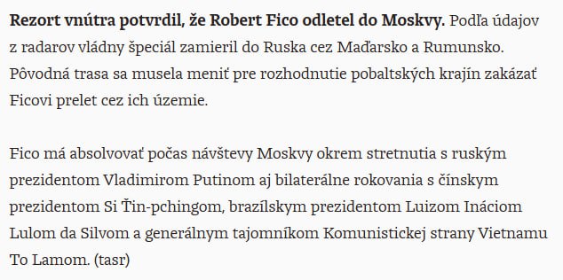 Как мы писали, вчера сам Фицо сообщил, что Эстония не разрешила ему пролёт над своей территорией для визита в Москву.