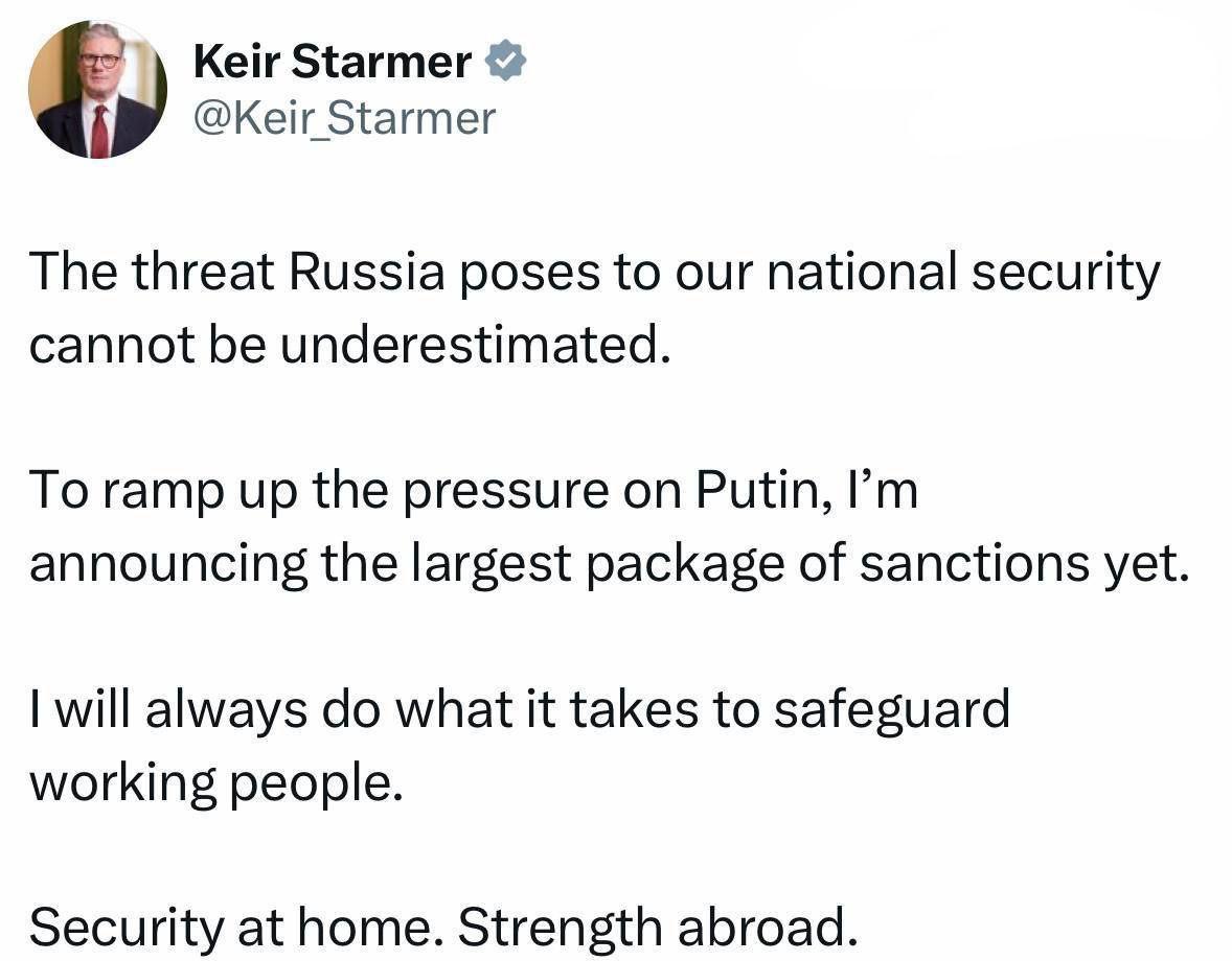 12:24 Британия 9 мая ввела крупнейший пакет санкций против РФ, сообщил премьер Кир Стармер.
