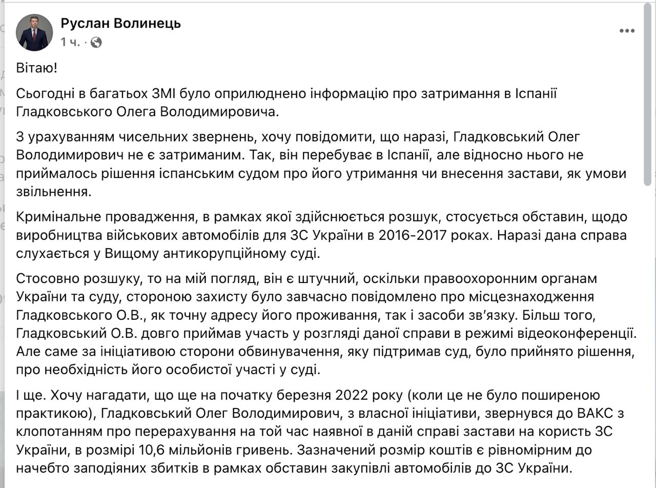"Гладковский Олег Владимирович не задержан. Да, он находится в Испании, но в отношении него не принималось решение испанским судом о его содержании или внесении залога как условия освобождения", - пишет Руслан Волынец.
