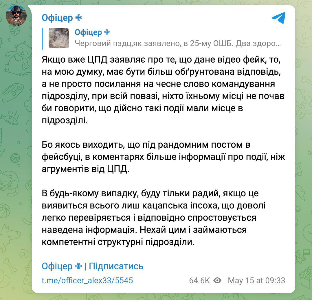 Однако старший лейтенант ВСУ с позывным Алекс в своем телеграм-канале написал, что этот инцидент мог произойти в 25-й отдельной штурмовой бригаде. Он призвал ЦПД дать "более обоснованный ответ, а не просто сослаться на честное слово командования подразделения".
