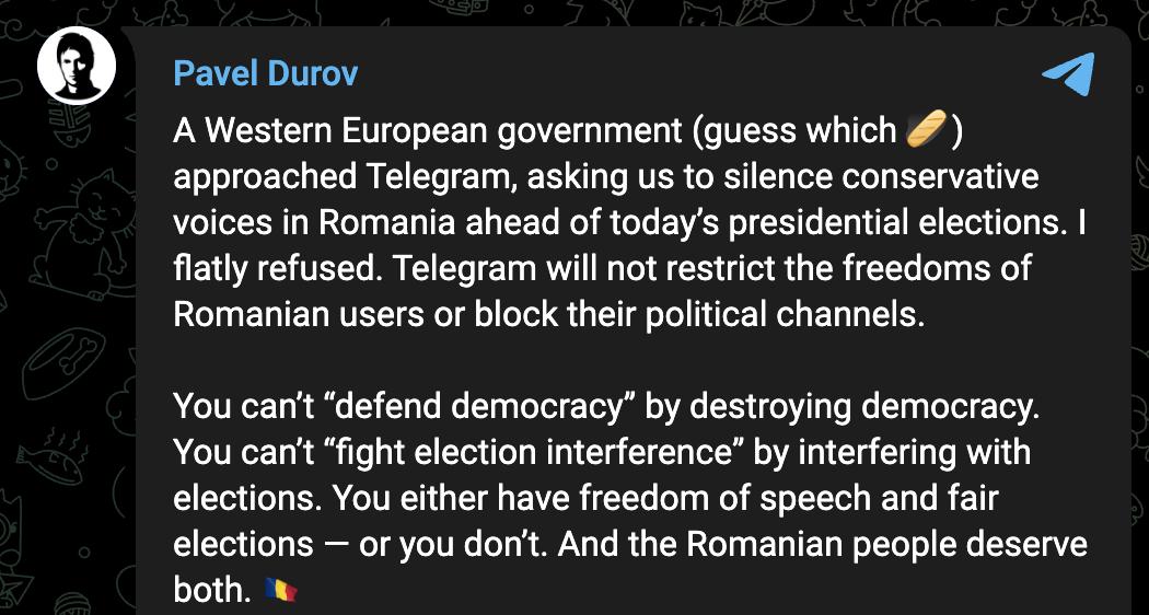 "Западноевропейское правительство (угадайте, какое?🥖 ) обратились к Telegram с просьбой заставить замолчать консервативные голоса в Румынии перед сегодняшними президентскими выборами. Я категорически отказался. Telegram не будет ограничивать свободы румынских пользователей или блокировать их политические каналы.