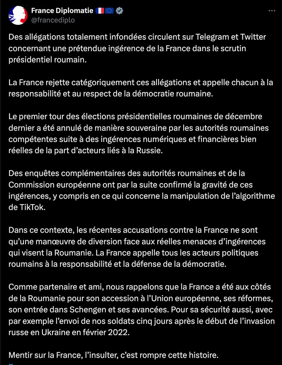 "Обвинения в адрес Франции являются лишь отвлекающим маневром перед лицом реальных угроз вмешательства в дела Румынии. Франция призывает всех политических деятелей Румынии проявить ответственность и защитить демократию", - заявил МИД Франции.