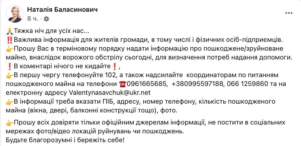 Мэр Василькова Баласинович назвала ночь "тяжёлой для всех нас" и дала жителям города контакты, куда обращаться по поводу повреждённого жилья.