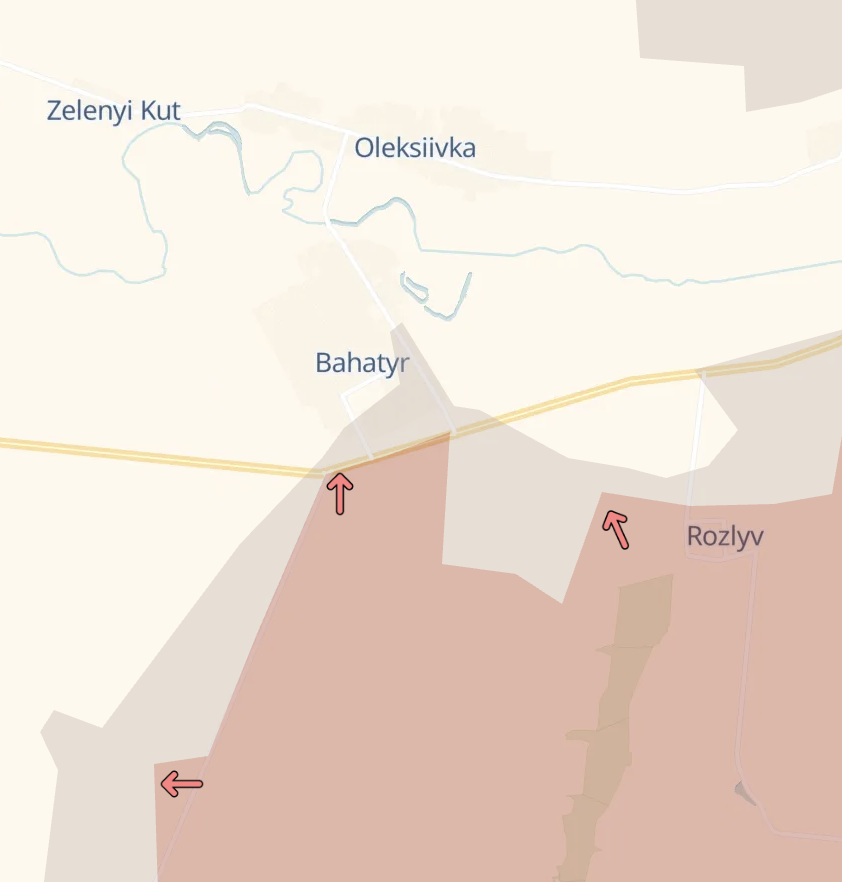 Южнее на этом же направлении россияне заявили о захвате села Богатырь. Украина этого не подтверждала. На карте DeepState (см вторую карту) Богатырь находится частично в серой зоне, частично - под контролем ВСУ.
