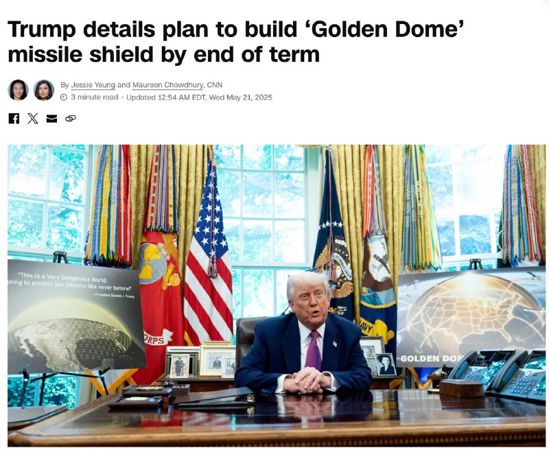 "Мы официально выбрали архитектуру для этой современной системы, которая будет внедрять технологии следующего поколения на суше, на море и в космосе, включая космические спутники обнаружения и перехватчики. Эта конструкция "Золотой купол" будет интегрироваться с нашими существующими возможностями обороны и должна быть полностью готова к концу моего срока. Так что мы закончим ее примерно через три года", - отметил он.